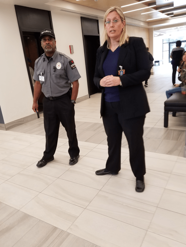 BETHY CAMPBELL came walking in just as ridiculous as Mamaluy looks in this photo only BETHY who towered over the guard , acting like she needed to be protected !